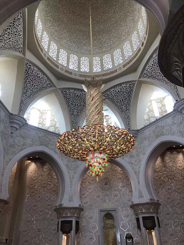 謝赫扎耶德清真寺是為已故老國王扎伊德所建,是阿聯酋的標志性建筑﹐整個建筑群都用來自南斯拉夫的白玉大理石,莊嚴肅穆,充分體現了伊斯蘭的風格。